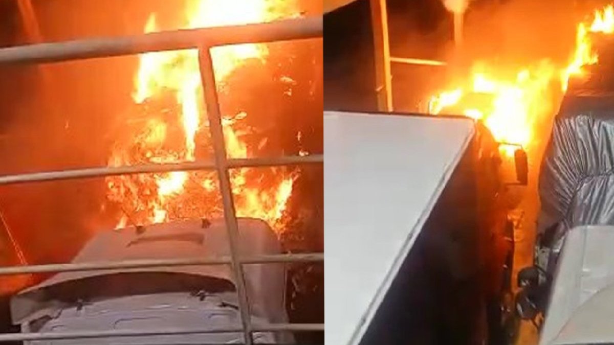Marmara Denizi'nde Tekirdağ-Balıkesir (Bandırma) seferini yapan feribottaki araçlarda sabah saatlerinde yangın çıktı. Yangın nedeniyle 9 araç kullanılamaz hale gelirken, yaşanan panik o sırada feribotta bulunan bir yolcu tarafından cep telefonuyla kaydedildi.
