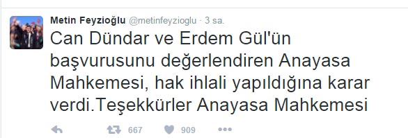 Metin Feyizoğlu,"Can Dündar ve Erdem Gül'ün başvurusunu değerlendiren Anayasa Mahkemesi, hak ihlali yapıldığına karar verdi.Teşekkürler Anayasa Mahkemesi" dedi.