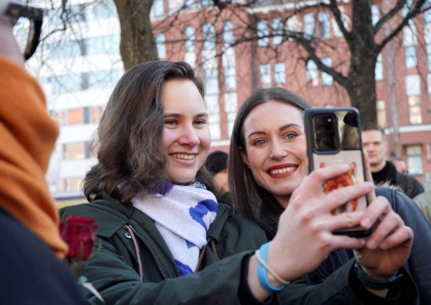 Finlandiya Başbakanı Sanna Marin, seçmenle selfie çekti.Finlandiya halkı, Rusya-Ukrayna Savaşı nedeniyle gündeme gelen güvenliğin yanı sıra ülke ekonomisinde beklenen toparlanma için de bu seçime büyük önem veriyor.