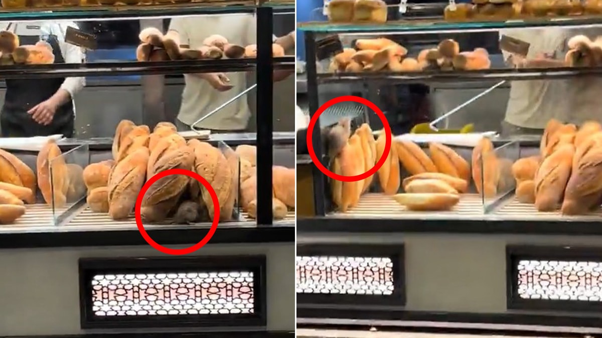 Görüntülerde, vitrindeki ekmeklerin arasında rahatça dolaşan fare açıkça görülüyor.