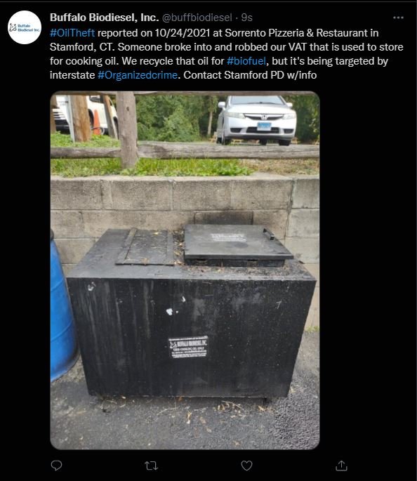 Twitter'da yağ hırsızlığı hakkında paylaşımlarda bulunan Buffalo Biodiesel şirketi, yalnızca son 24 saat içinde New York'ta yedi restorandan kullanılmış yağ çalındığını duyurdu.