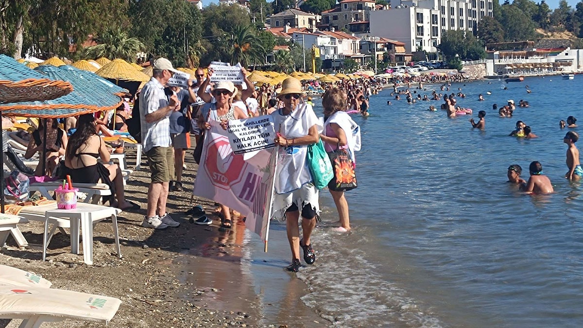 Çevredeki evlerde oturanlar ile ilçe dışından gelen ve giriş ücreti ödemeden denize giremeyen kişiler de kalabalık tarafından eyleme katılmaya davet edildi. Eyleme katılanlar havlularıyla, 1'inci Mersinaki Sahili'ndeki 3 beach clup ile Yenifoça plajlar bölgesindeki sahilde neredeyse denize sıfır konumdaki şezlong ve şemsiyelerin önünde suyun içinde yürüyerek, tepkilerini dile getirdi. Sahilde güneşlenen ve denizde yüzenler de eyleme katılarak ya da alkışlarla destek verdi.
