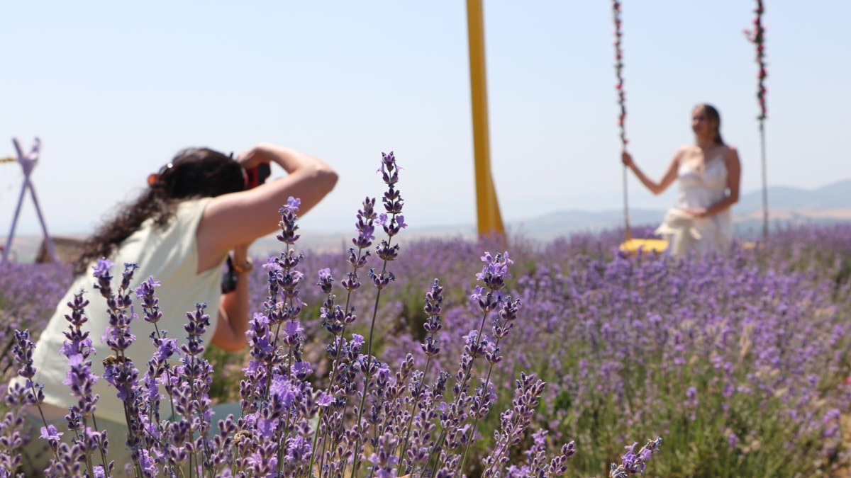 Ziyaretçilerin yanı sıra fotoğraf tutkunları da lavanta tarlalarında oluşturulan dekorlar önünde en güzel fotoğrafı çekmek için bölgeye geliyor.