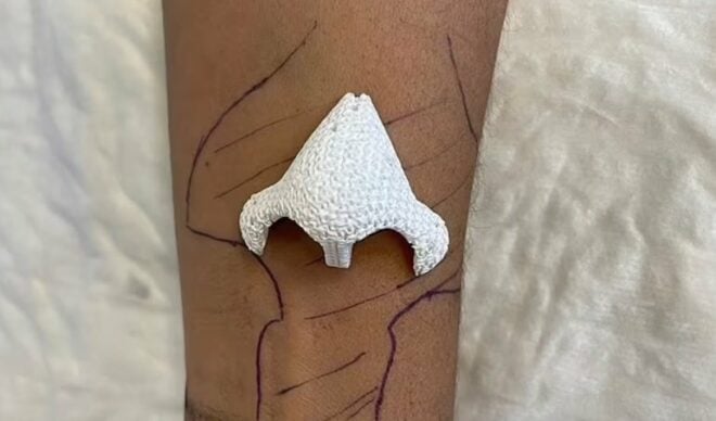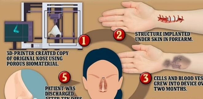 Ameliyat öncesinde kadının burnunun bir kopyasını 3D yazıcıyla alan uzmanlar, bu örneği yeni tıp teknolojileri için buzda bekletti. Doktorlar temmuzda kadının koluna bir cihaz yerleştirerek kolda burun gelişmesini sağladı.