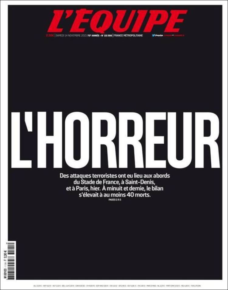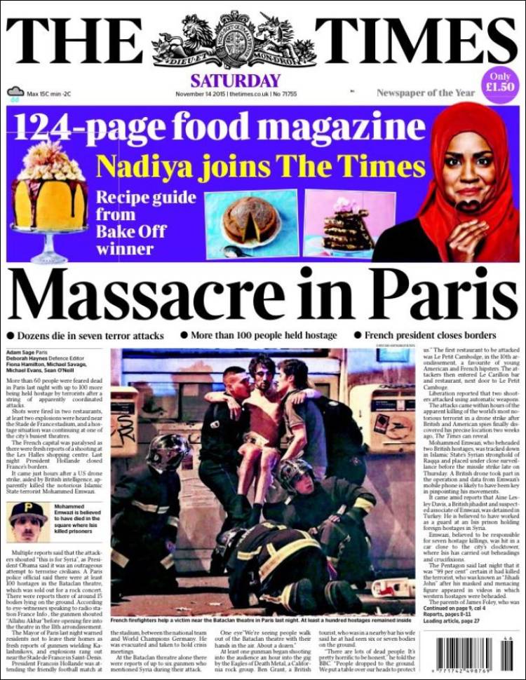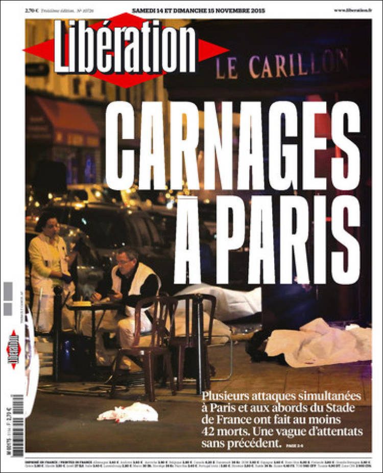 Fransa'nın başkenti Paris'teki eş zamanlı terör saldırılarını, dünya basını manşetlerine taşıdı. Neredeyse tüm dünyanın ortak sözü, yaşananın 'katliam' ve 'vahşet' olduğuydu.