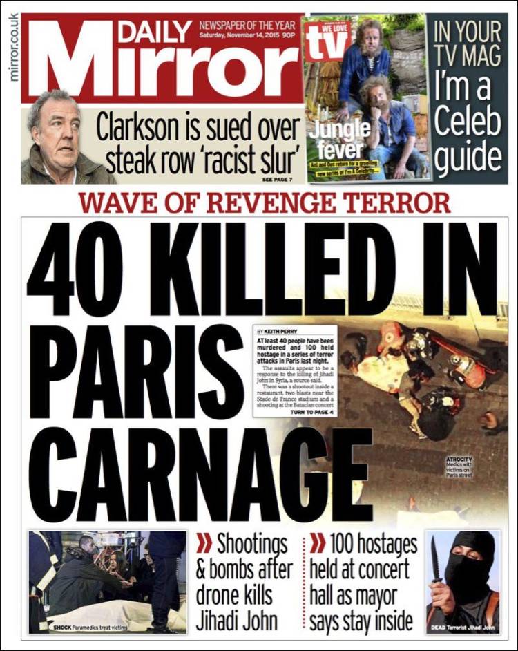 DAILY MIRROR: Paris vahşetinde 40 kişi öldürüldü