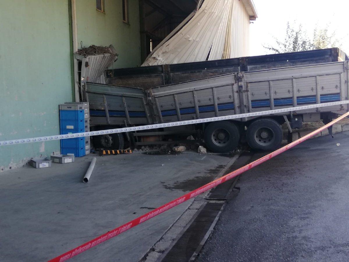 Bursa'da Nilüfer Organize Sanayi Bölgesi'nde freni boşalan Tır, park halindeki araçlara çarparak, bir fabrikanın duvarından içeri girdi.