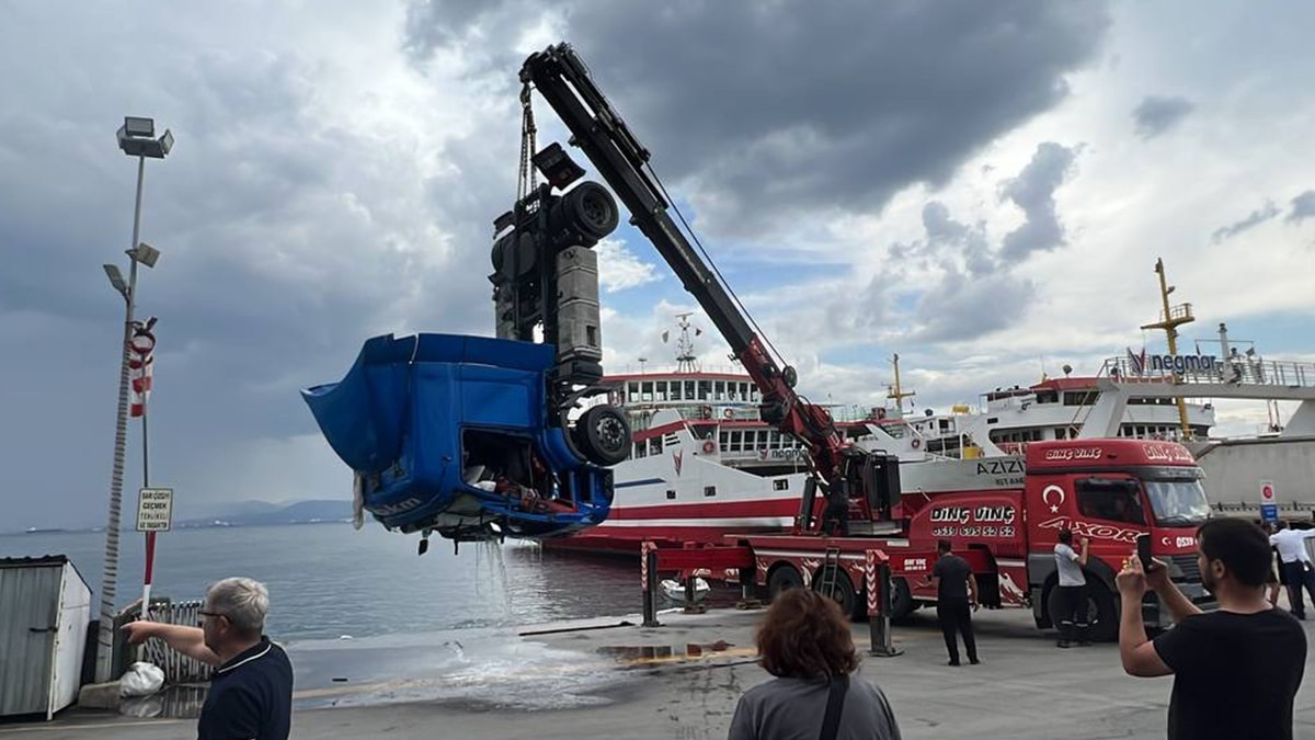 Kocaeli'nin Gebze ilçesinde arabalı vapur iskelesinde arızalı durumdaki TIR, freninin boşalmasıyla denize düştü. Araçtan sızan yağ ve mazotun yayılmaması için denize halat bariyer ve emici pedler bırakıldı.