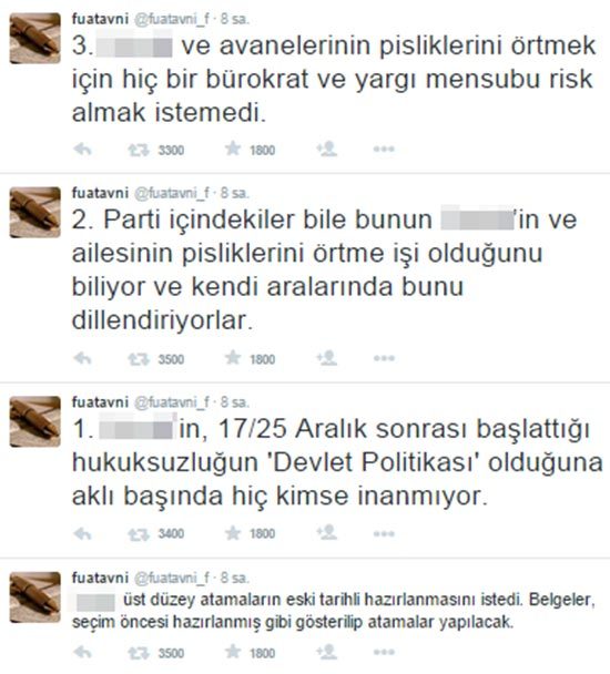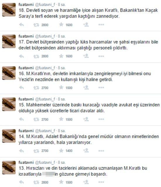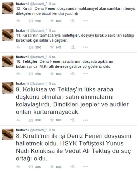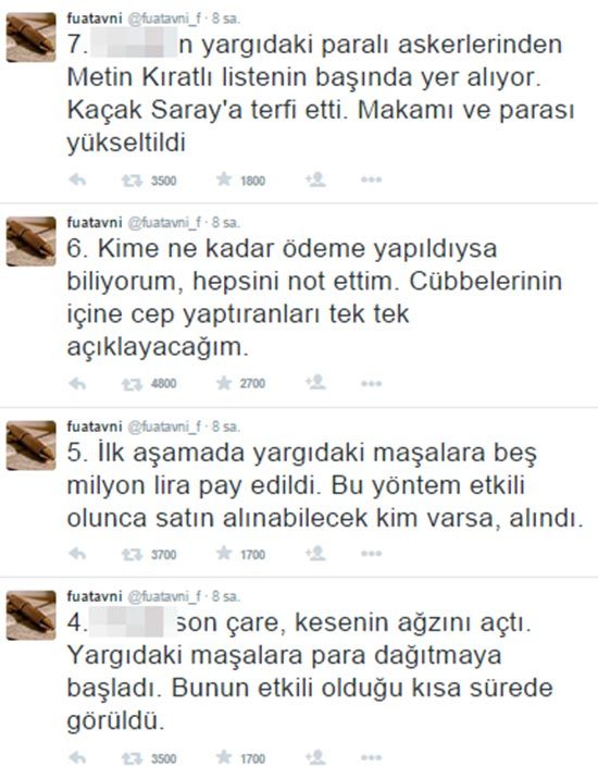 Twitter fenomeni Fuat Avni yine bomba iddialar gündeme getirdi. Yargıda yapılan son atamaları Erdoğan tarafından verilen talimatla eski tarihli hazırlandığını iddia eden Fuat Avni bunun nedeninin atamaların seçim öncesi hazırlanmış gibi gösterilip yeni atamalar yapılmak istenmesi olduğunu yazdı. Erdoğan'ın yargıdaki bazı isimlere para dağıttığını iddia eden Fuat Avni'nin bu iddiaları yine çok konuşulacak. İşte o tweetler...