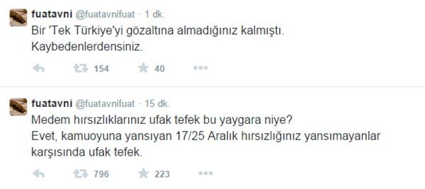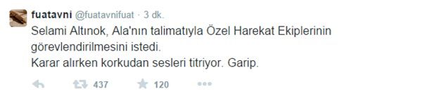 Twitter'da operasyon için gözaltı listesi yayınlayan Fuat Avni yeni iddiaları paylaşmaya devam ediyor. Fuat Avni sabah attığı tweetlerde operasyon için 1 Mayıs kuralları geçerli olduğunu iddia ederek 8 bin kişilik bir çevik kuvvet operasyon için hazır bekletildiğini açıkladı. Fuat Avni en son tweetinde ise Bülent Arınç'a çağrıda bulundu. Operasyon iddialarıyla ilgili 'vahim' açıklaması yapan Arınç'a 'Uyuyor musun' dedi. Fuat Avni, operasyon sonrası tweetlerine devam etti. Takipçilerine 'sağduyu ve dimdik durma' tavsiyesi veren Fuat Avni Arınç'a da bir göndermede bulundu.