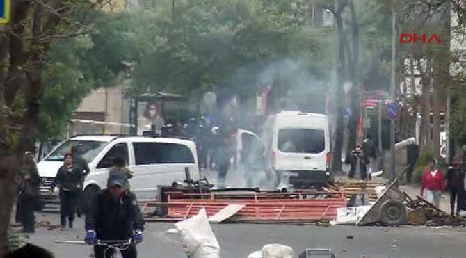 Grup çöp konteynerlerini devirerek barikat kurdu. Çevik kuvvet polisleri grubu tazyikli su ve biber gazıyla dağıttı. Grup müdahalenin ardından ara sokaklara kaçtı. Polisin gruba müdahalesi sürüyor.