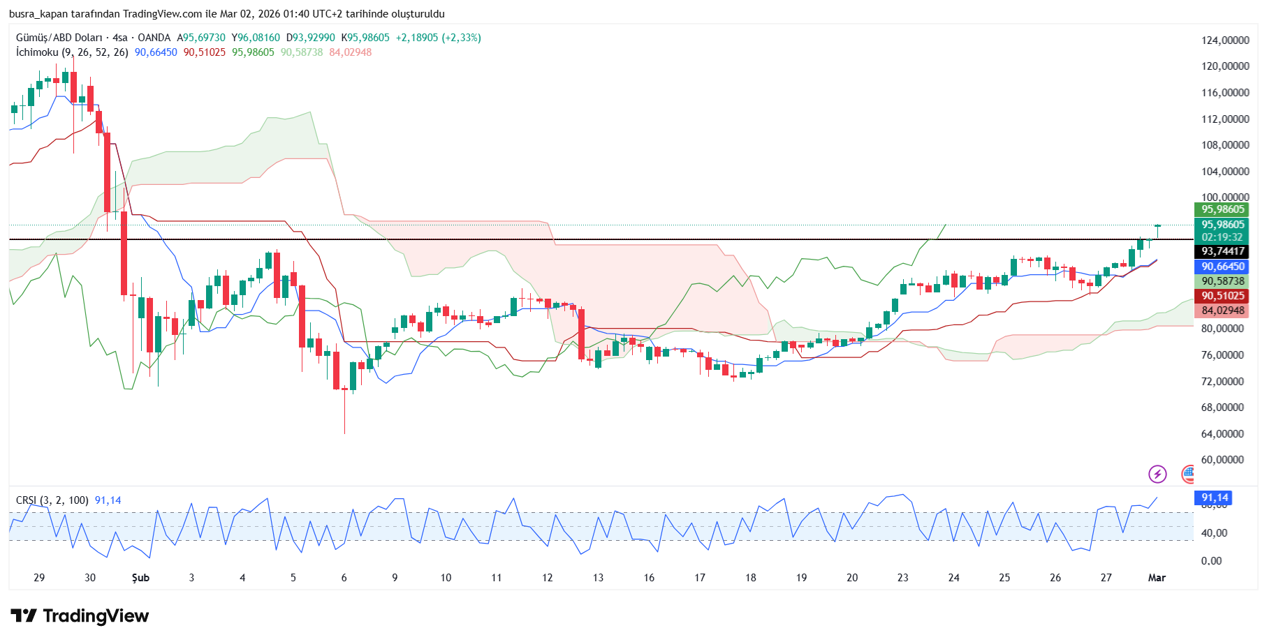 Gümüş fiyatları da yönünü yukarı çevirdi. Geçtiğimiz haftayı 93.79 dolardan kapatan ons gümüş yeni haftanın ilk işlem gününde gece seansında 02.10'da yüzde 2'den fazla değerlenerek 95.98 dolara yükseldi.