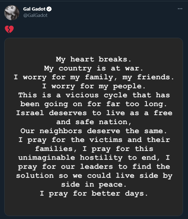 Aynı zamanda eski bir İsrail askeri olan 36 yaşındaki oyuncu, kalbinin nasıl kırıldığını ifade etmek için Twitter'a gitti.