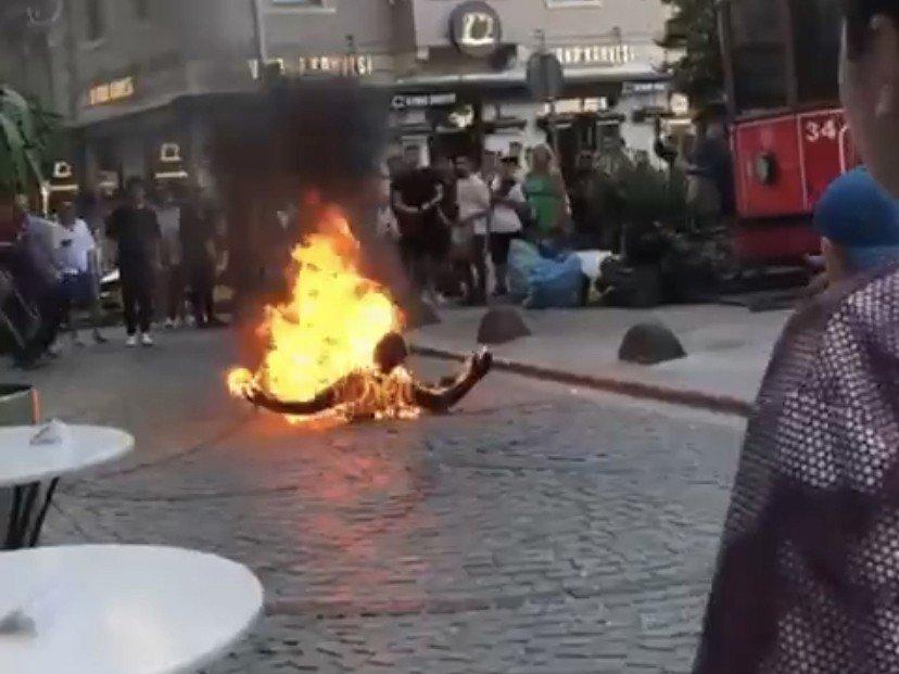 - Hemen yangın tüpünü aldım ve müdahale ettim. Yanan kişiyi söndürdüm ve ambulansa haber verdim. 10 dakika sonra ambulans geldi. Şahıs hastaneye kaldırıldı. Sosyal medyada da benim üzerimden yanmasını mı bekledin? diye tabirler kullanmışlar. Ben böyle bir şeyi ilk defa gördüm. Şaşkınlıkla izledim. İlk müdahaleyi de ben yaptım. O sırada çevredekiler fotoğraf ve video çekiyordu. Adamın da üzerinde siyah bir kostüm vardı, elinde de bir orak vardı. Değişik bir giyiniş tarzı vardı. Her şey bir anda oldu.