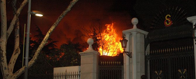 Beşiktaş'daki tarihi Galatasay Üniversitesi öğrencilerinde bulunduğu sırada henüz bilinmeyen bir nedenden dolayı alev alev yandı. Saray bölümüden başlayan yangın kısa sürede büyüyerek tüm binayı sardı.