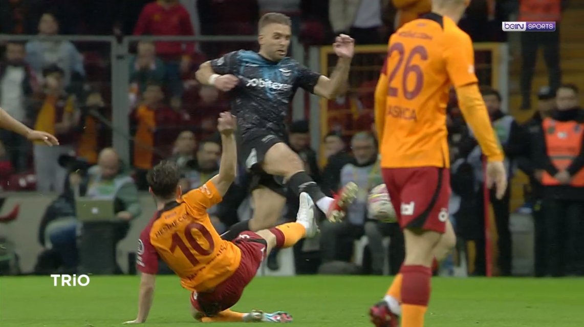 Seçim Demirel: Emre Akbaba topa doğru gitmek isterken Galatasaraylı oyuncu blokluyor. Oyuncu ondan kurtulmaya çalışırken hakem düdük çalıyor. Keşke orada Galatasaraylı oyuncunun bloklamasına düdük çalsaydı, hiç bu pozisyon yaşanmayacaktı. Emre Akbaba'nın pozisyonuna baktığımda, ayağa net bir oturma görmediğim için hakem kararına saygı duyuyorum. Kırmızı olsaydı daha doğru olurdu ama sarı verdiği için hakemi de eleştiremiyorum. VAR zaten bu pozisyona müdahale edemezdi.