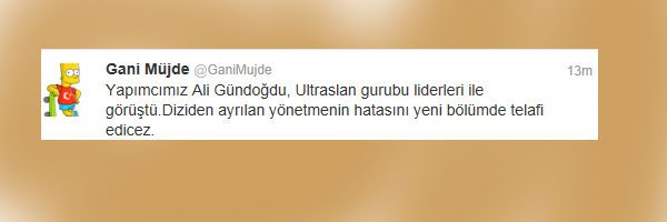 Twitter'da Galatasaray taraftarlarının senarist Ganü Müjde'ye, 'Şeref yoksunu Gani Müjde Galatasaray'dan özür dile' etiketiyle başlattığı kampanya üzerine Müjde "Bana dün geceden beri küfür edenlere bir şey ifade eder mi bilemiyorum ama sahneyi kafasına göre çeken yönetmen (Ersoy Güler) görevinden ayrıldı" dedi.