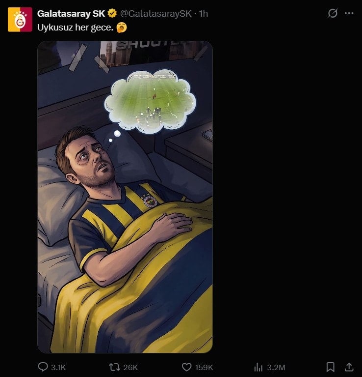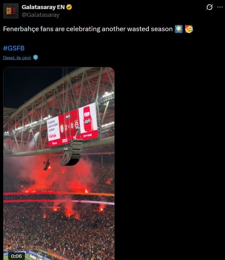 Galatasaray'ın 3. golünün ardından kulübün resmi İngilizce hesabından da "Fenerbahçe taraftarları boşa geçmiş bir sezonu daha kutluyor" şeklinde paylaşım geldi. Bu gönderi de dakikalar içinde 50 binin üzerinde beğeni aldı.