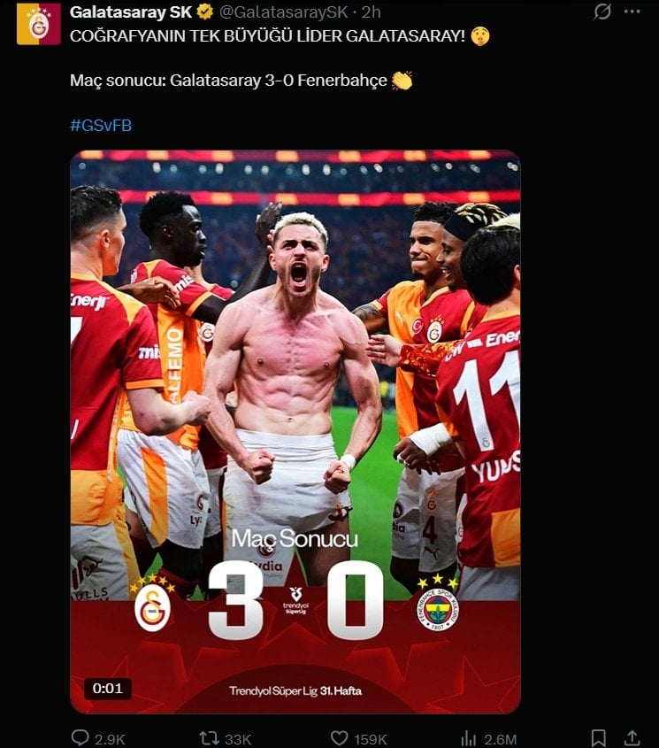 Galatasaray'ın galibiyetini duyurduğu ilk gönderide 'Coğrafyanın tek büyüğü Galatasaray' ifadelerine yer verildi. Paylaşım, dakikalar içinde 150 bin beğeniyi aştı.