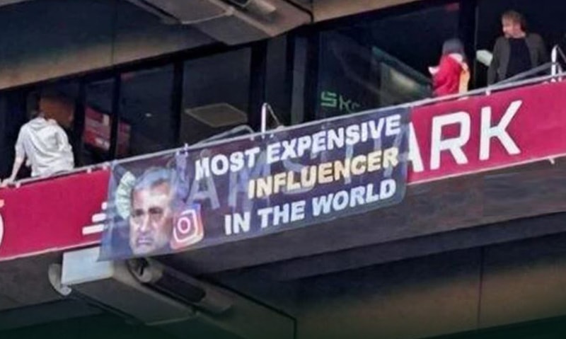 Galatasaraylı taraftarlar, maç öncesi RAMS Park'ta Jose Mourinho'ya yönelik, "Dünyanın en pahalı influencerı" pankartı açtı.