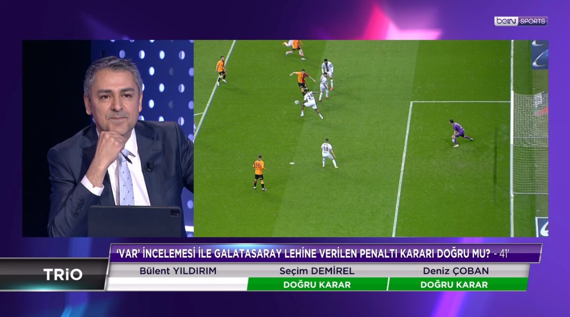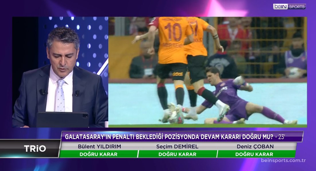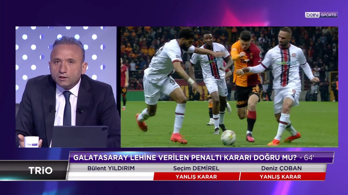 Deniz Çoban: MHK acaba artık işin içinden çıkamıyor mu bilemiyorum. Yaşanan sürecin hakemler üzerinde çok büyük baskı oluşturduğunu, artık karar standartlarını kaybettiklerini görüyorum. Burada hakem arkadaşlarımı eleştirirken de cümlelerimi seçerek kullanmaya dikkat edeceğim. Bu maç ve geçen haftadaki maçları gördükten sonra hakemlerin sahada duygu yükü altında olduklarını ve bu yükün de kararlarını etkilediklerini düşünüyorum. Evet kesinlikle bir faul var bu pozisyonda. Galatasaraylı oyuncu, üst baldırıyla ayağını savururken arkadan oyuncuyu rahatsız ediyor. Bence burada faul var. Bence dediğim için o yüzden VAR hakeminin yapabileceği bir şey yok.