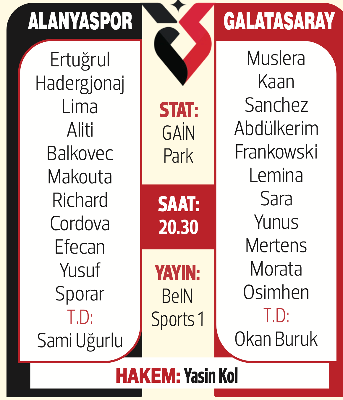 Galatasaray hem yeni çıkış yakalamak hem de takipçisi Fenerbahçe ile arasındaki farkı açmak için Alanya deplasmanına çıkıyor. Kazanması halinde ezeli rakibinin BAY geçtiği haftada 7 puanlık avantaj yakalayacak namağlup Cimbom ligde 26 maçtır yenilmiyor.