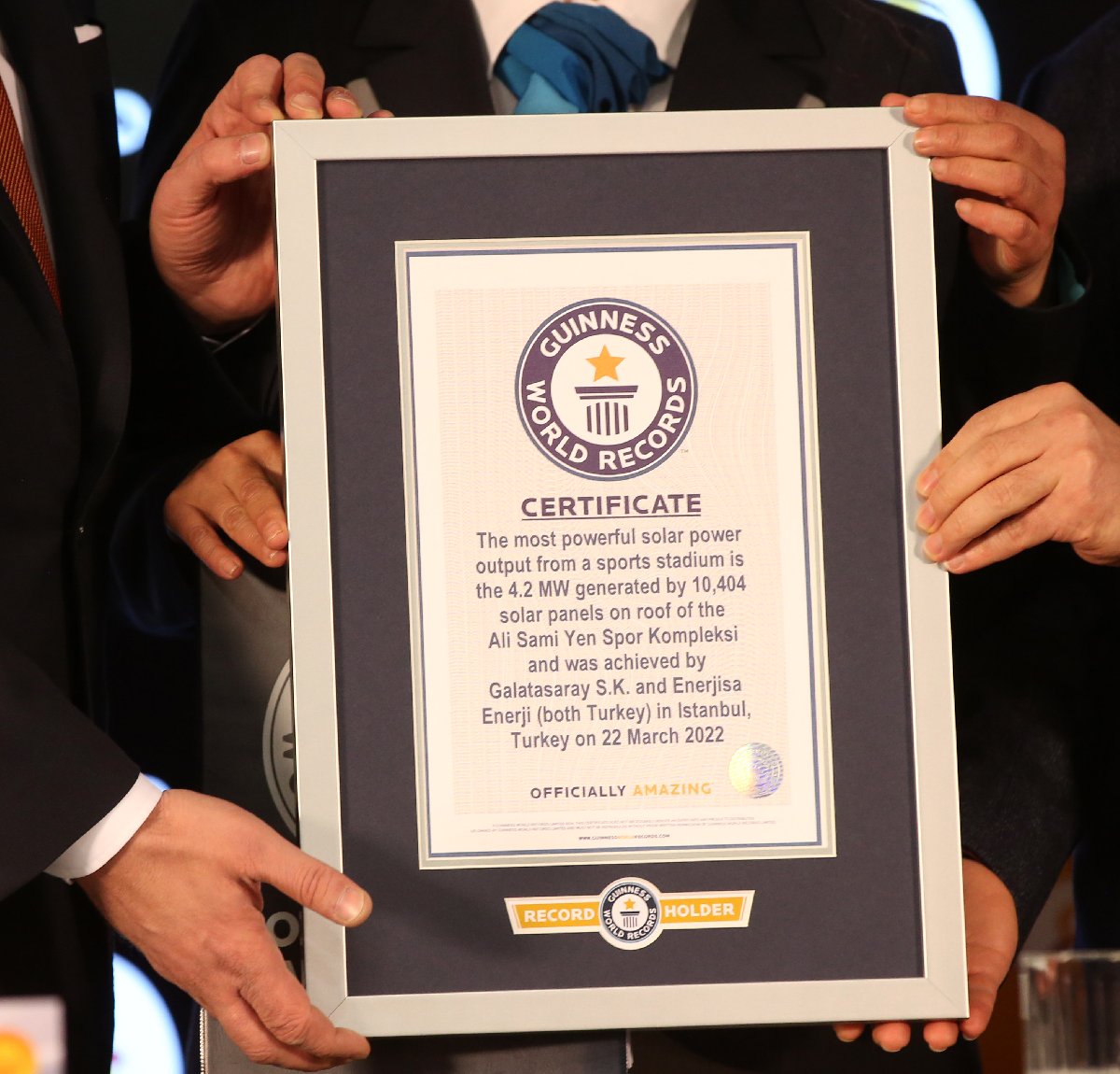 Güneş Enerji Santrali devreye alma ve Guinness Rekor takdim töreni Nef Stadyumu'nda gerçekleştirildi. Törene, Galatasaray Başkanı Burak Elmas, Galatasaray Başkan Yardımcısı Sayın Bikem Kanık, Enerjisa Enerji CEO'su ve Enerjisa Müşteri Çözümleri Yönetim Kurulu Başkanı Murat Pınar ve Enerjisa Müşteri Çözümleri Yönetim Kurulu Başkan Yardımcısı Ersin Esentürk katıldı. Stadyumu maç günleri dışında da gelir elde eden ticari bir alana çevirmek istediklerini söyleyen Burak Elmas, "Galatasaray yine bir ilki gerçekleştiriyor. Rahmetli başkanımız Mustafa Cengiz yönetiminde imzalanan bu önemli projenin bitişi bizim dönemimize denk geldi. Emeği geçen başta merhum başkanımız Mustafa Cengiz ve yönetim kuruluna teşekkür etmek istiyorum. Ayrıca bu konuda bizimle önemli ortaklığa işbirliğine imza atan Enerjisa'ya da teşekkür ediyoruz. Kısa sürede bu önemli projeyi sonuçlandırdılar. Tam zamanında hatta biraz daha erken bitirerek Galatasaray'ın ve Türkiye'nin geleceği için önemli bir projeye daha imza attılar. Stadyumumuzda çok daha fazla fonksiyonu devreye sokarak daha çok gelir etmek, maç günleri dışında da gelir kalemleri üreten ticari alana çevirme projemiz var. Bu proje için de Enerjisa ile yapmış olduğumuz bu yatırımın çok büyük önemi var. Stadyum üzerine kurulan santral, 25 yılın sonunda ciddi anlamda gelir üretecek. Hatta proje devreye girdikten sonra kulübümüz için ciddi bir maliyet kalemi olan enerji maliyetlerinde de ciddi bir avantaj sağlamaya başladı. Güneş enerji santrali, Türkiye'de stat çatısı üzerinde performansa dayalı iş modeli hayata geçirilmiş ilk projedir. Bu anlamda bu ilk projeyi gerçekleştiren kulübün Galatasaray olması nedeniyle de büyük gurur duyuyoruz" ifadelerini kullandı.