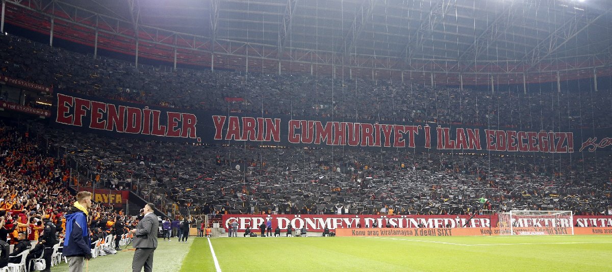 Ardından taraftarlar aynı tribünde kartonlarla Türkiye haritası ve ortasında Türk bayrağına, doğu tribününde ise Galatasaray'ın Cumhuriyet'in 100. yılı logosuna yer verdi.