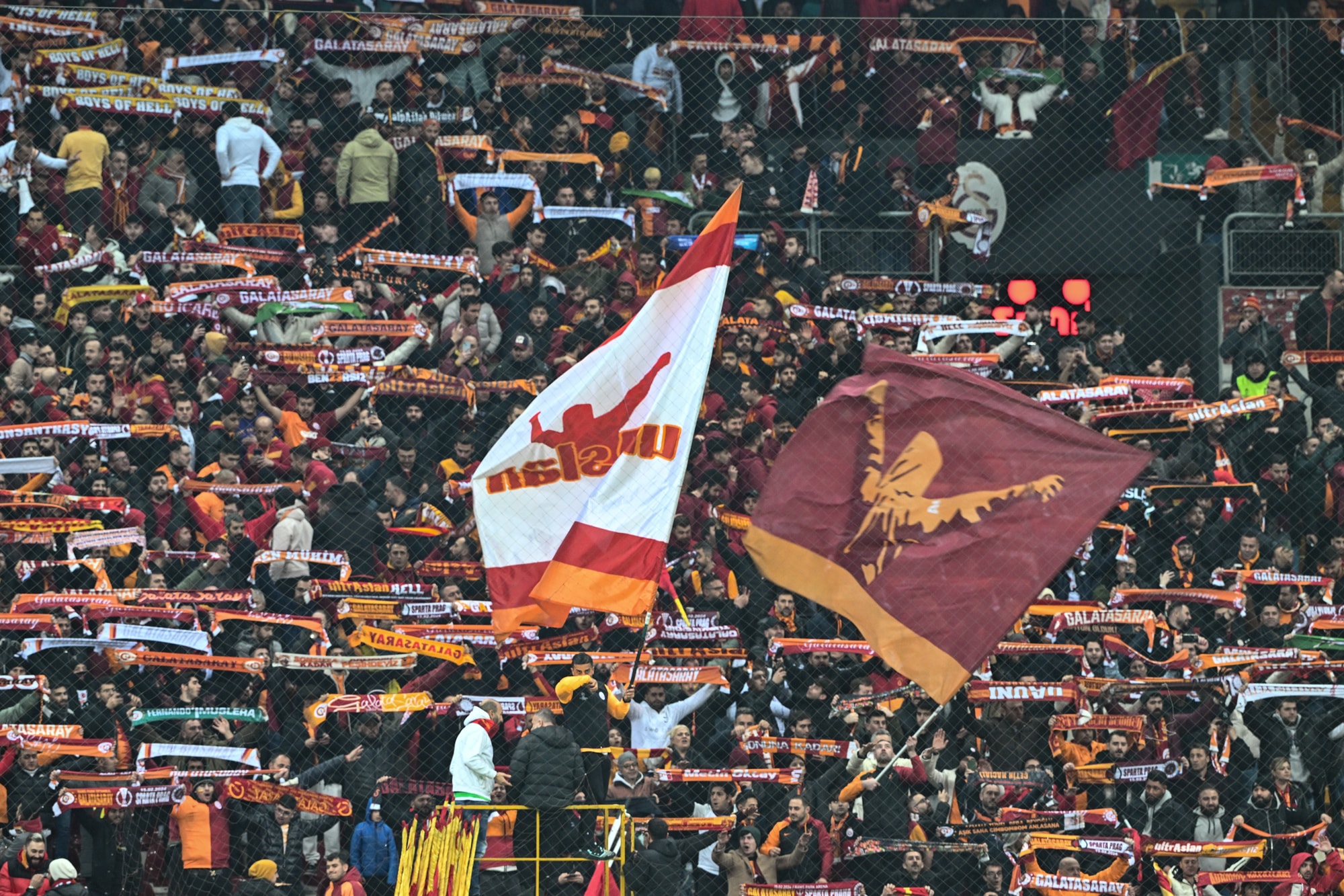 Karşılaşmanın başlama düdüğünden çok kısa bir süre önce “Galatasaray tek, siz hepiniz”, “Bu takım bu sene söke söke şampiyon”, “Şampiyon olduğumuzda da basiretiniz bağlanacak”, “Galatasaray’ın Galatasaraylı’dan başka dostu yoktur” pankartları açıldı.