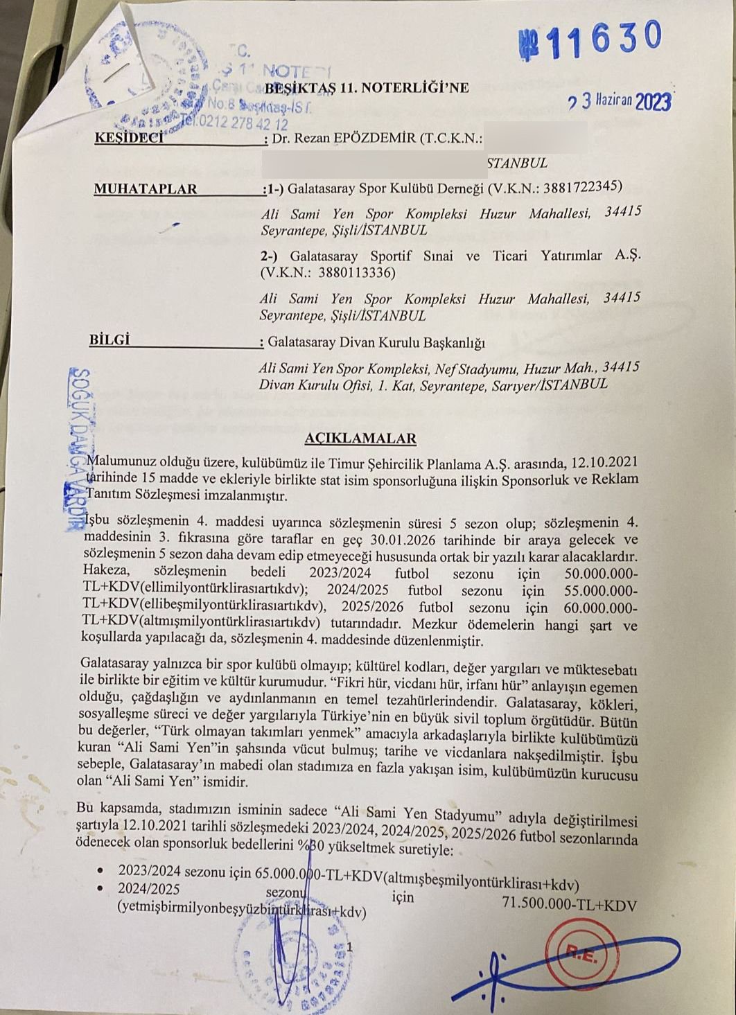 Galatasaray'ın eğitim ve kültür kurumu olduğuna dikkat çeken Epözdemir, "Galatasaray, kökleri, sosyalleşme süreci ve değer yargılarıyla Türkiye'nin en büyük sivil toplum örgütüdür. İşbu sebeple Galatasaray'ın mabedi olan stadımıza en fazla yakışan isim, kulübümüzün kurucusu olan 'Ali Sami Yen ismidir" ifadelerini kullanırken ilgili teklif, noter onaylı olarak cuma günü itibarıyla kulübe ve bilgi amaçlı olarak Galatasaray Divan Kurulu Başkanlığına tebliğ edildi.