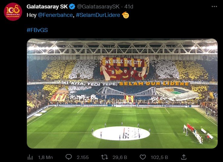32. dakikada Sergio Oliveira, 78'de Kerem Aktürkoğlu ve 90+10'da Mauro Icardi'nin golleriyle ezeli rakibini deplasmanda mağlup eden Galatasaray, aldığı bu galibiyet sonrası sosyal medya hesabından görseller paylaştı. Sarı-kırmızılı ekibin paylaştığı gönderide, "Hey Fenerbahçe Selam Dur Lidere” ifadeleri kullanıldı.