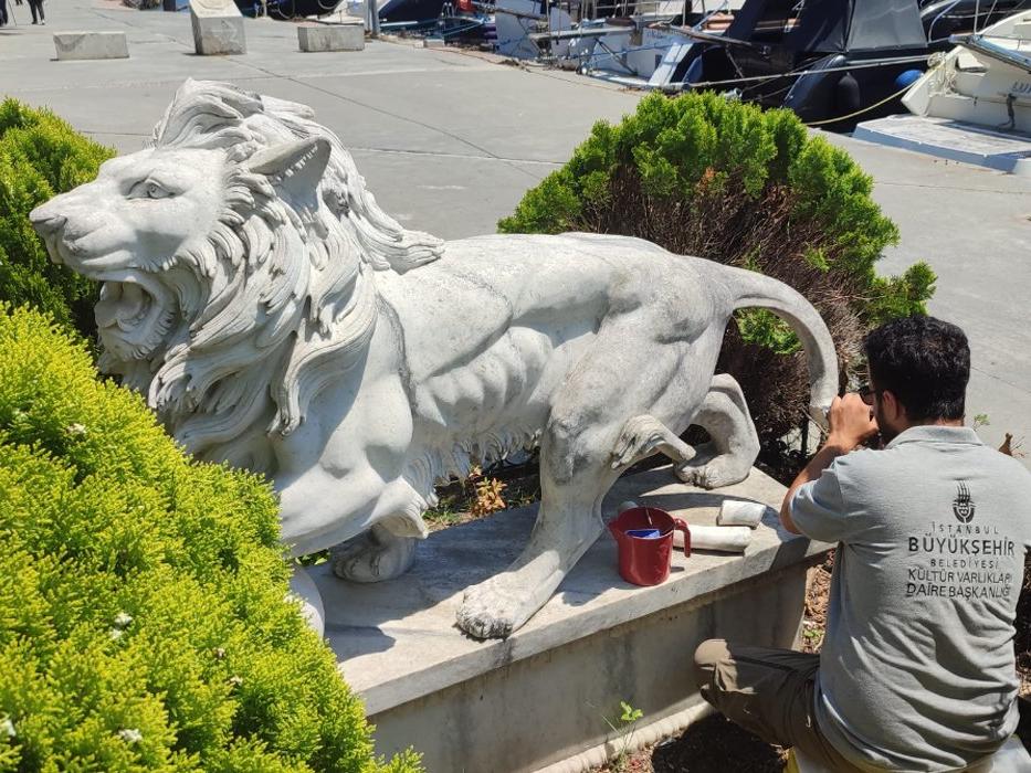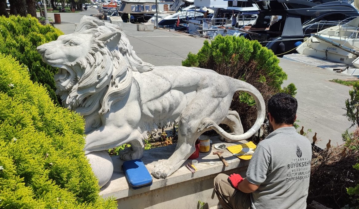 Sabah saatlerinde bölgeye gelen ekipler aslanın kırılan kısımlarını onarıp temizlik çalışması yaptı.