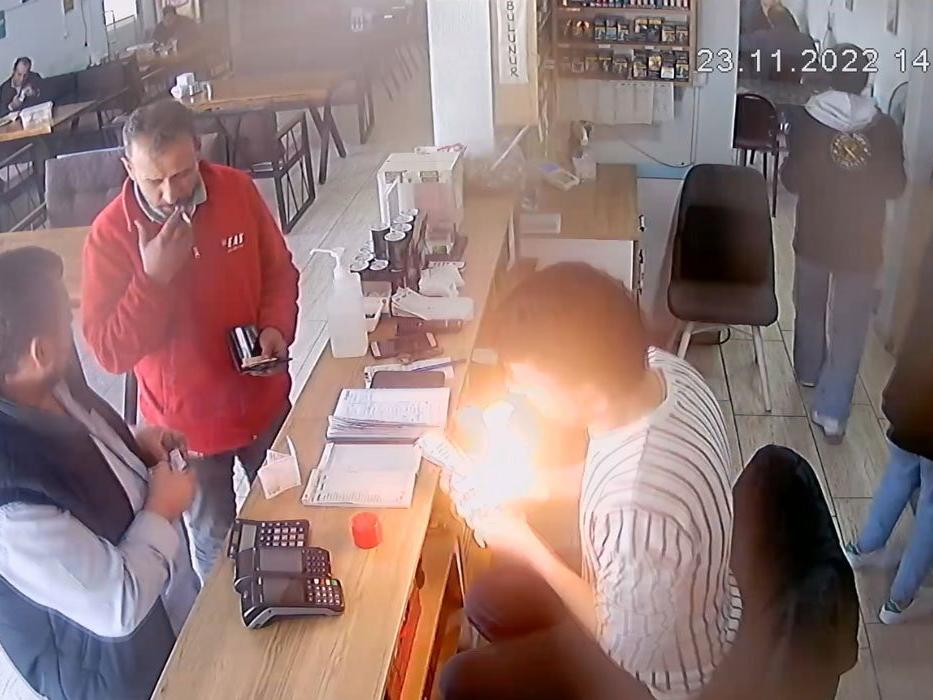 Amasya'nın Taşova ilçesinde esnaf Tayyip Akgül'ün (28) gaz dolumu yaptığı çakmak patlayarak alev aldı. O anlar iş yerinin güvenlik kamerasına yansıdı.