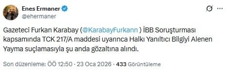 "Gazeteci Furkan Karabay İBB Soruşturması kapsamında TCK 217/A maddesi uyarınca Halkı Yanıltıcı Bilgiyi Alenen Yayma suçlamasıyla şu anda gözaltına alındı."