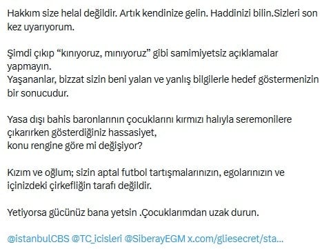 Ancak iki yıldır bana diş geçiremeyen; buna rağmen çocuklarıma tecavüz edeceğini söyleyecek kadar alçalan, kendisini “Galatasaraylı” olarak tanımlayan ve anonim hesaplar arkasına saklanan bu şerefsizlerin bulunmasını talep ediyorum.