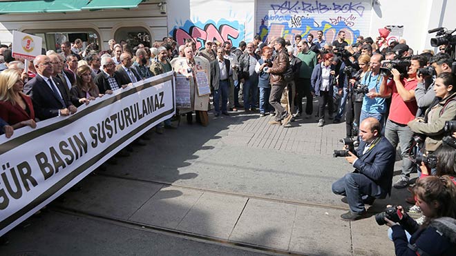 Beyoğlu Tünel Meydanı'nda bir araya gelen çok sayıda gazeteciye CHP milletvekilleri de destek verdi. Basına yönelik baskı ve saldırılara tepki içerikli pankart ve dövizlerle gelen gazeteciler, buradan Galatasaray Meydanı’na yürüyecek. Yürüyüş sonunda basın açıklaması yapıldı. (CİHAN)
