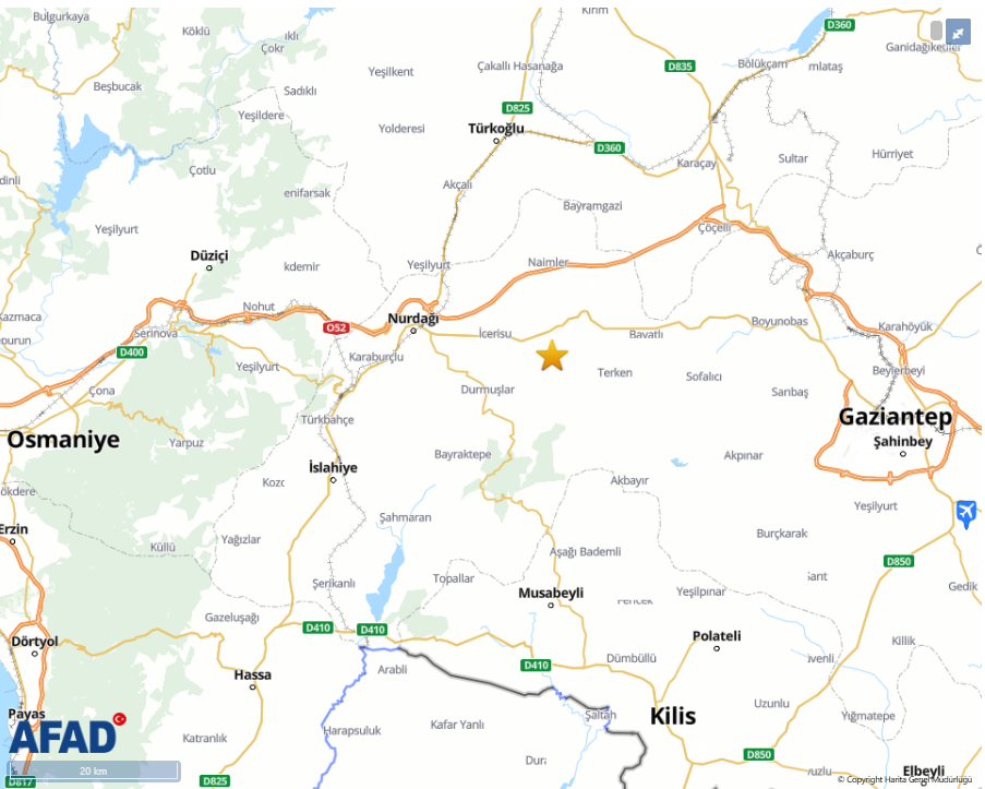 Afet ve Acil Durum Yönetimi Başkanlığının (AFAD) internet sitesinde yer alan bilgiye göre, merkez üssü Nurdağı ilçesi olan 4,1 büyüklüğünde sarsıntı kaydedildi.