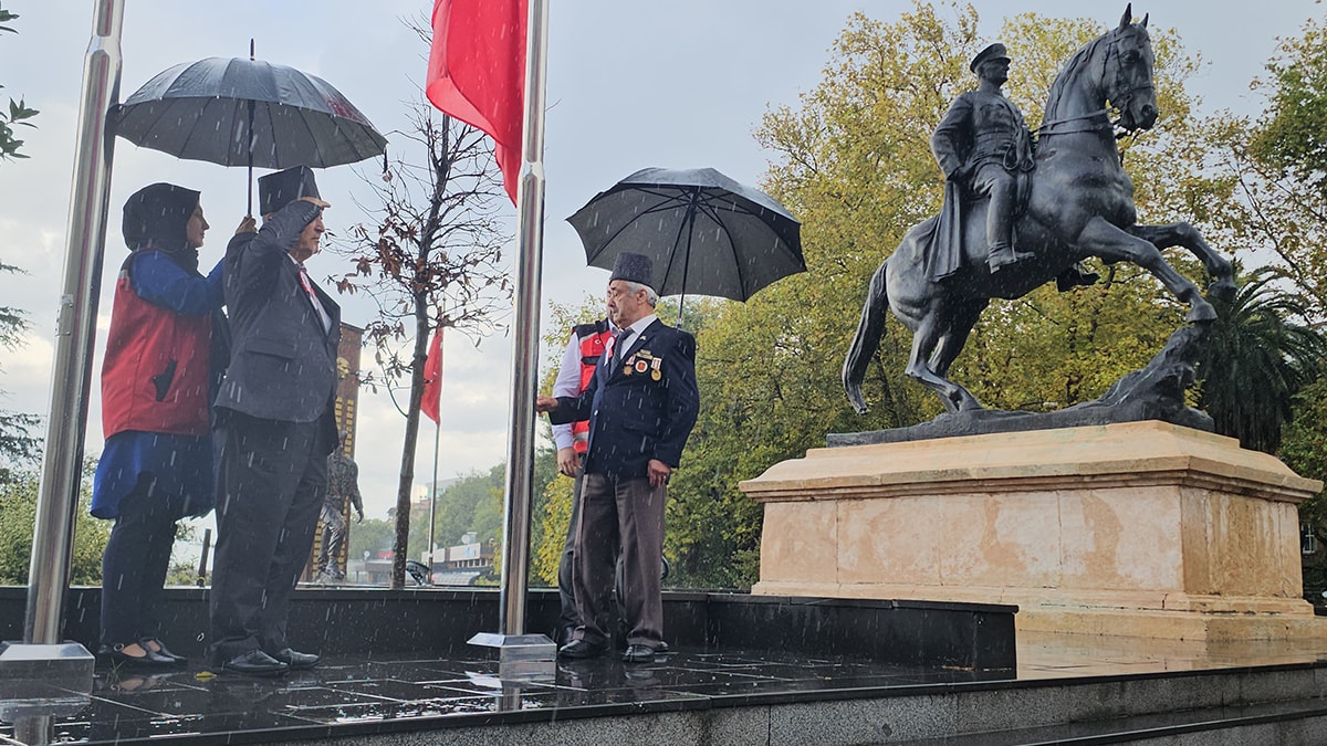 Çelenk sunma ve bayrağın göndere çekilmesinde görevli gazilerin ıslanmaması için ise korumalar ve görevliler tarafından şemsiye tutuldu. Tören, çelenk sunumunun ardından okunan İstiklal Marşı ve saygı duruşu sonrası sona erdi.