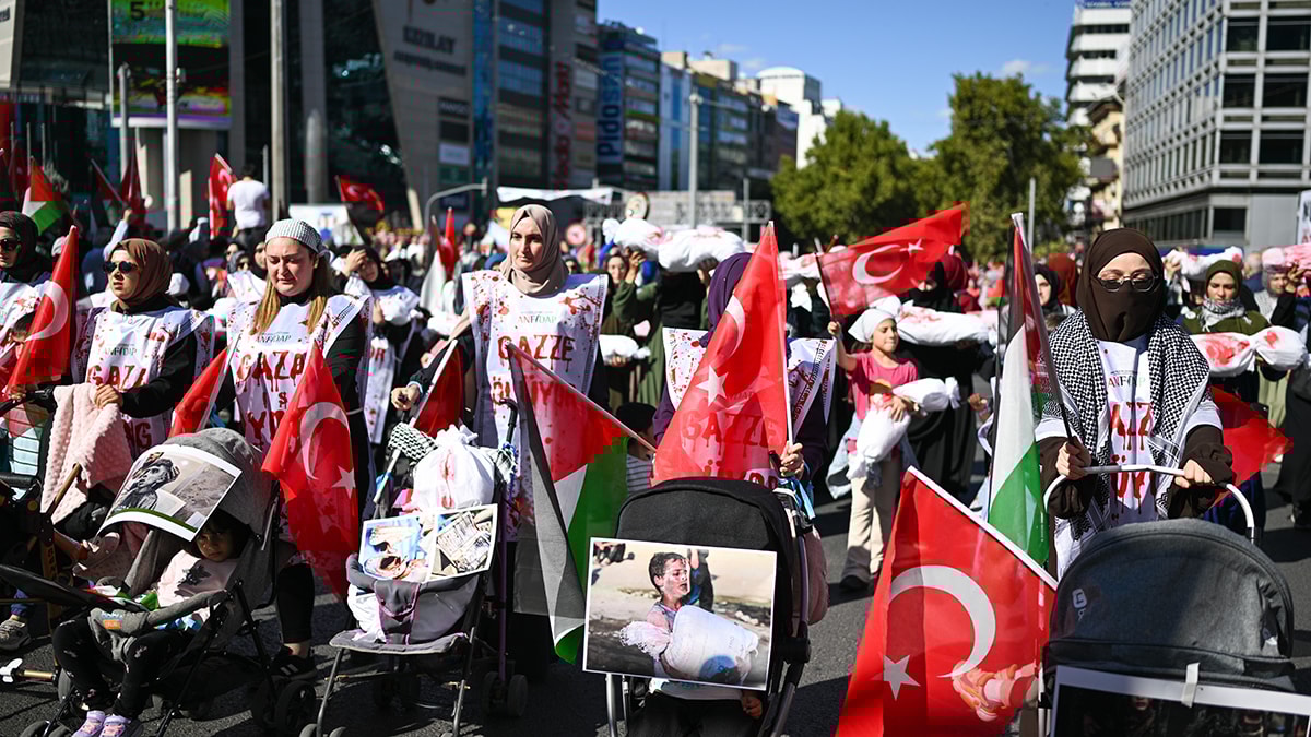 “Deniz’den nehire özgür Filistin”, “İsrail Filistin’den defol” sloganları atıldı. Basın açıklamasında, tüm dünyaya “Alanları doldurma, grev ve boykotlarla direnme” çağrısı yapıldı. Ulaştırma ve Altyapı Bakanı Abdulkadir Uraloğlu, Ankara Valisi Vasip Şahin ve bazı milletvekilleri de yürüyüşe katıldı.