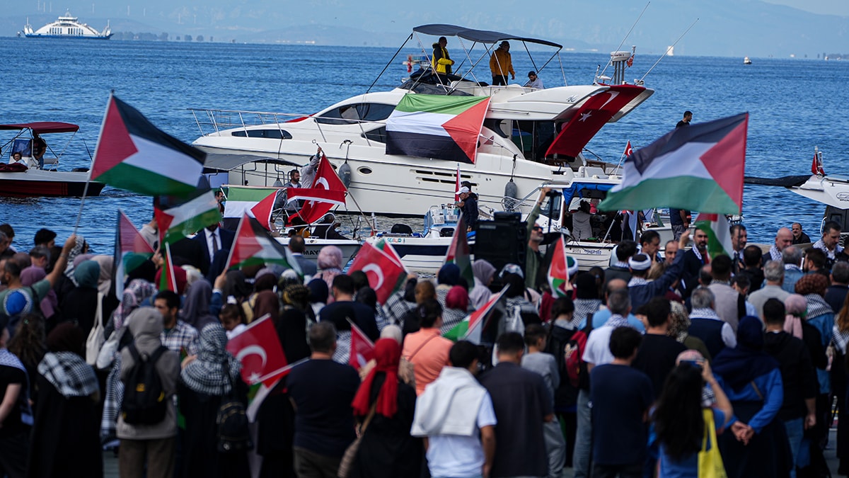 İZMİR: Tekneler Türk ve Filistin bayraklarıyla denize açıldı. Vatandaşlar protestoya karadan destek verdi.