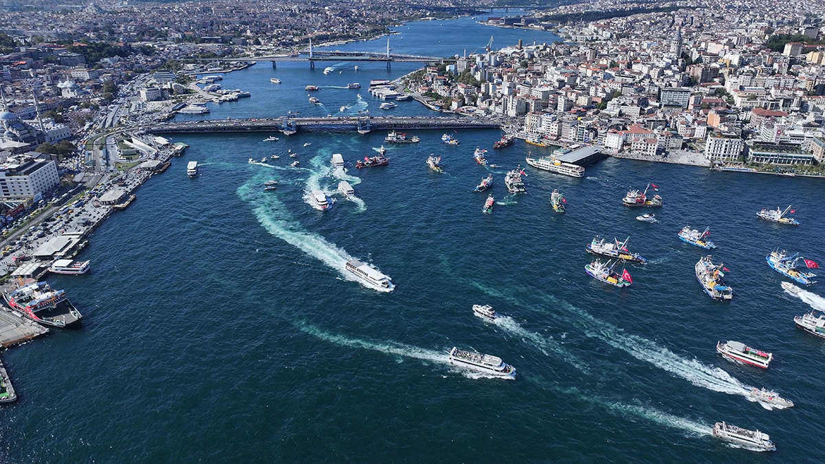 İstanbul Boğazı’ndan geçen çok sayıda tekne, Filistin bayrakları açarak Eminönü’ne geldi. Yürüyüşe katılanlara Haliç’ten destek verdi.