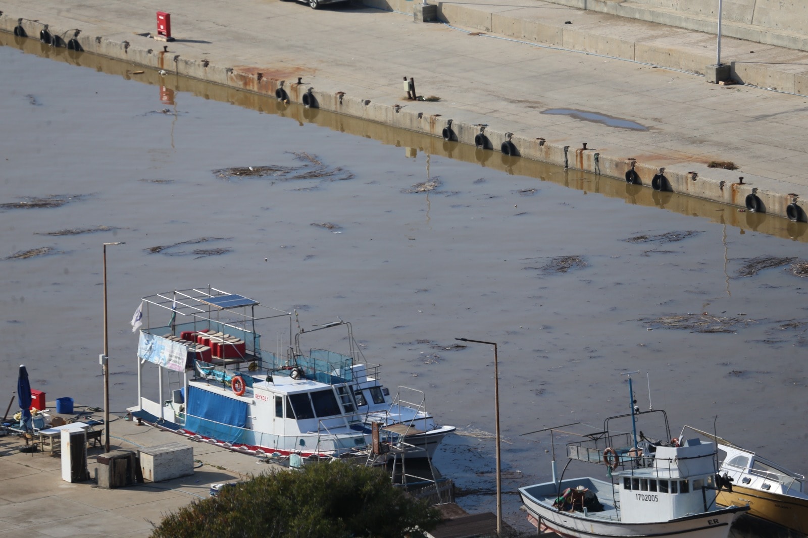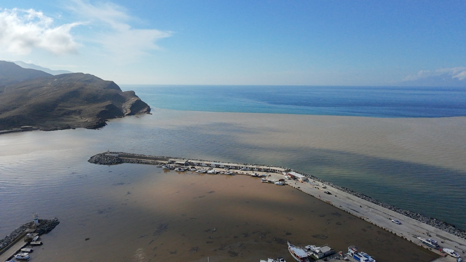 Yağışın ardından Kaleköy Ovası’ndan denize karışan çamurlu sular, limandaki denizin rengini değiştirdi. Dağlardan taşınan toprak ve bitki kalıntıları, teknelerin bağlı bulunduğu alanlarda birikintiler oluşturdu.
