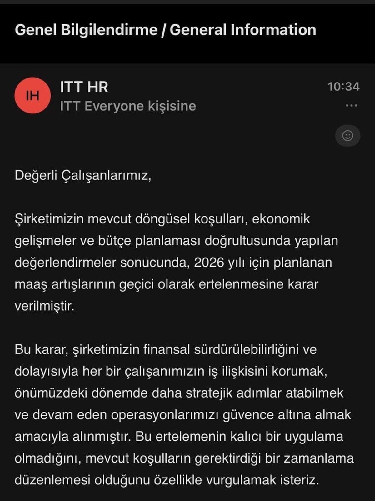 “Şirketimizin mevcut döngüsel koşulları, ekonomik gelişmelere ve bütçe planlaması doğrultusunda yapılan değerlendirmeler sonucunda, 2026 yılı için planlanan maaş artışlarının geçici olarak ertelenmesine karar verilmiştir.”