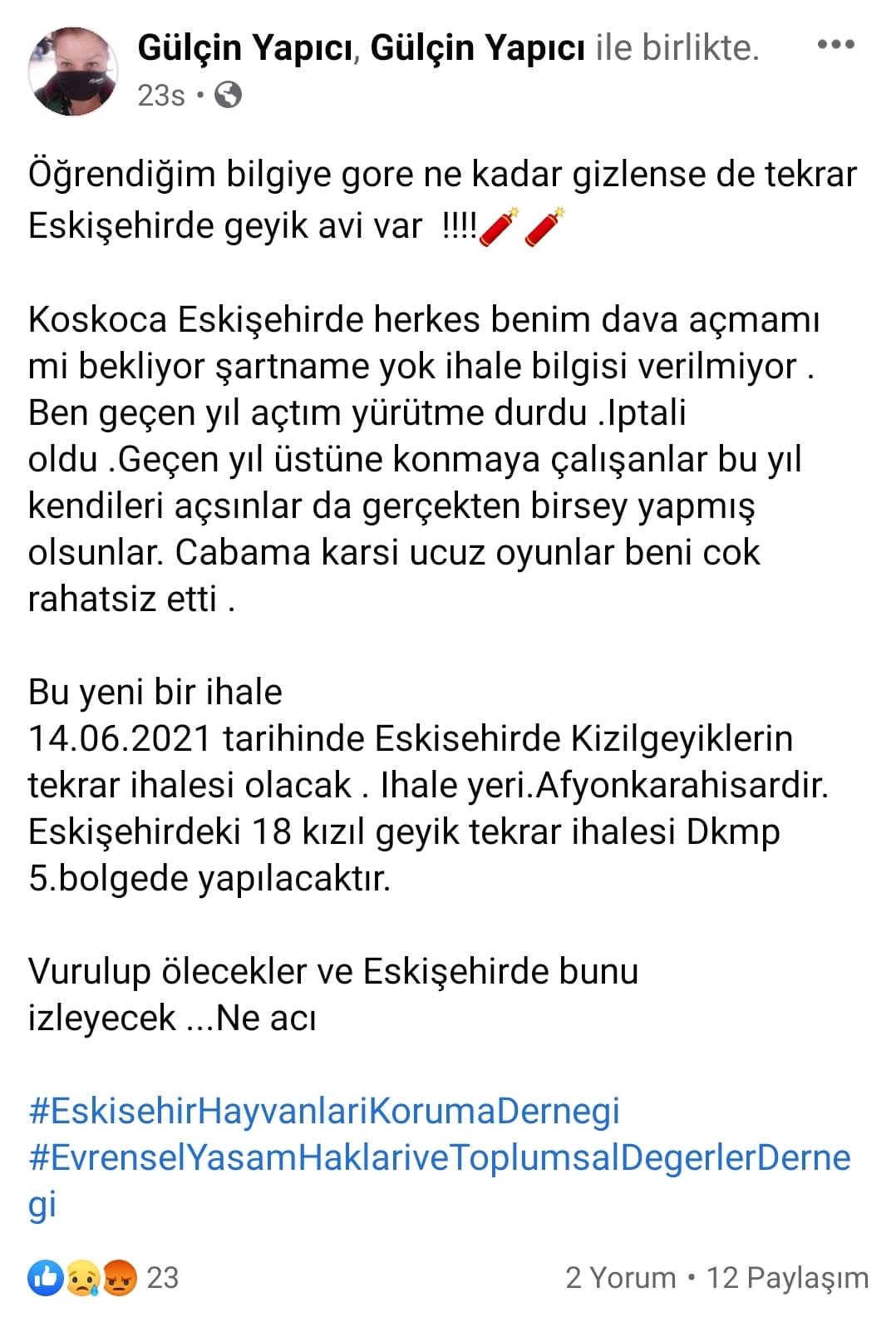 Eskişehir Hayvanları Koruma Dernek Başkanı Av. Gülçin Yapıcı da geyik ihalesine sosyal medyadan yaptığı paylaşımla tepki gösterdi. Yapıcı paylaşımında şu ifadelere yer verdi:
