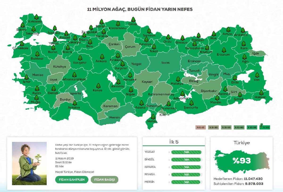 3 Kasım saat 09.15 itibari ile sahiplenilen fidan sayısı 9 milyon 977 bin 896 oldu. Hedeflenen rakam ise 11 milyon 47 bin 430. Ayrıca site üzerinden fidan bağışı da yapılabiliyor.