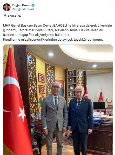 “MHP Genel Başkanı Sayın Devlet BAHÇELİ ile bir araya gelerek ülkemizin gündemi, Terörsüz Türkiye Süreci, Alevilerin Temel Hak ve Talepleri üzerine konuşup fikir alışverişinde bulunduk. Kendilerine misafirperverliklerinden dolayı çok teşekkür ediyorum.”