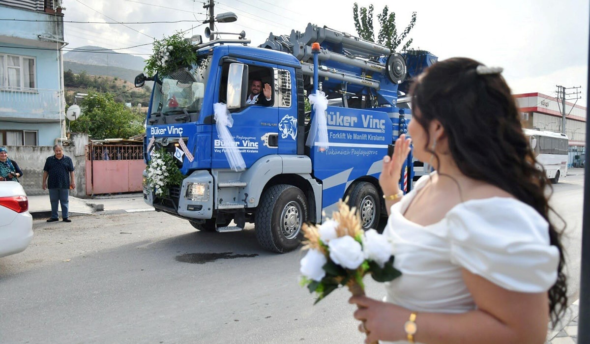 Manisa'nın Yunusemre ilçesinde 15 yıldır vinç operatörü olarak çalışan Doğan Çoban, çalıştığı vinci gelin arabası yaparak, eşi Funda Akar'a sürpriz yaptı. Kayapınar Mahallesi'nde oturan Funda Akar’ın evine gelin arabası gibi süslediği vinçle gelen damat Çoban, herkesi şaşırttı.