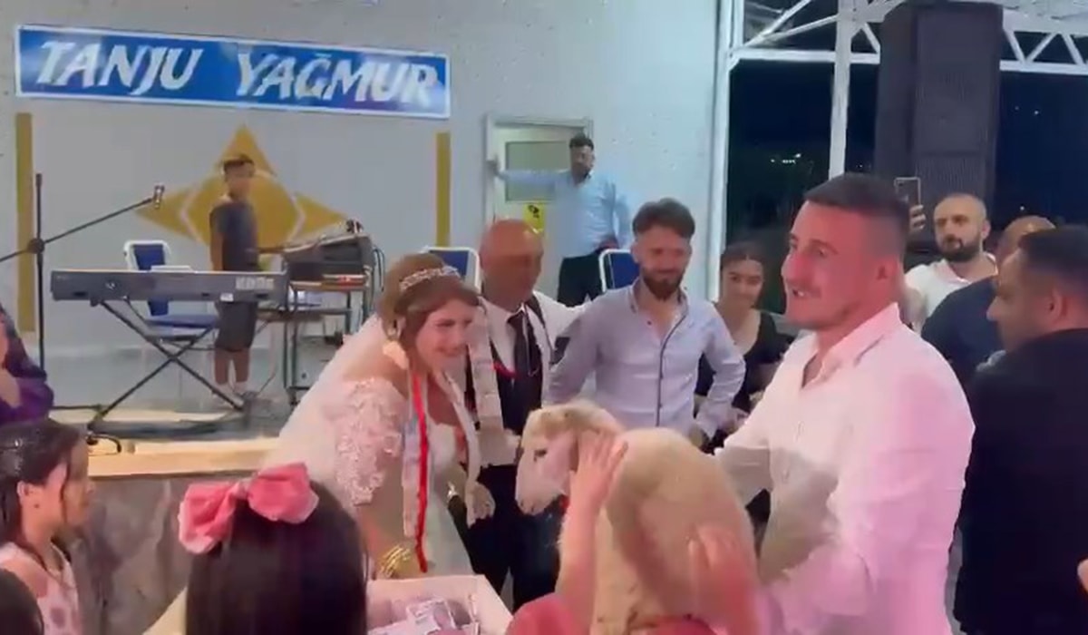 Eğlence sonrası takı töreninde, damadın bir arkadaşı düğün salonunun kapısından kucağında koyunla içeri girdi.