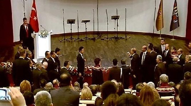 Feyzioğlu kürsüden inmek isteyince kurultaya katılan bazı avukatlar, Feyzioğlu'nu kürsüye dönmesi için ikna etmeye çalıştı. Divan Başkanı Ercan Şişek de, "Başkanım, özür diliyoruz, acemiliğimize verin. Misafirperverliğimizden kaynaklanmıştır. Sözünüzü tamamlayın" dedi.