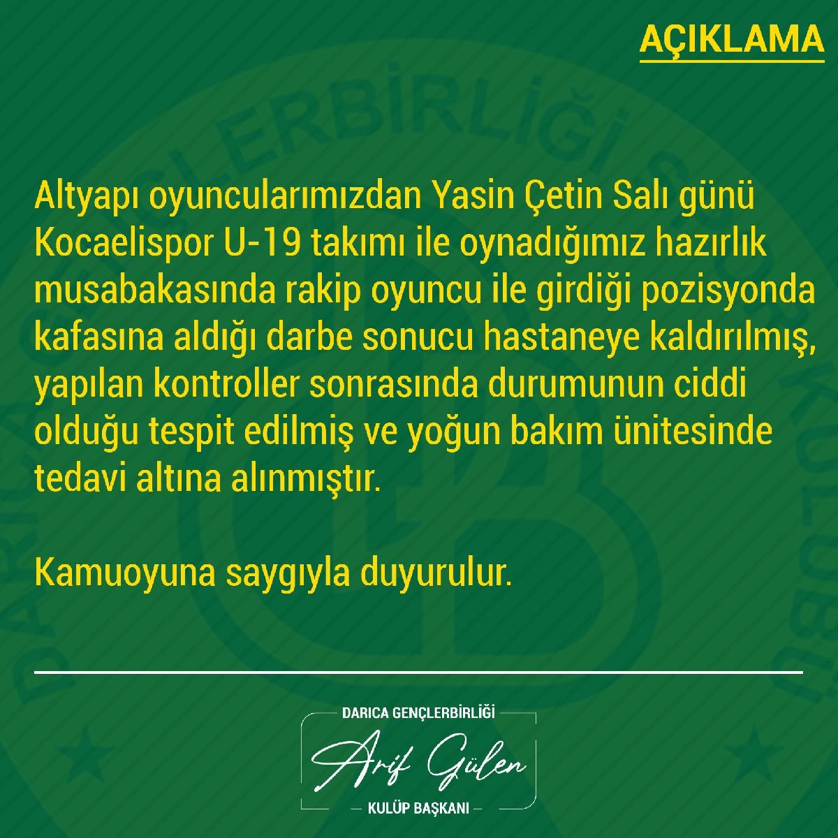 Genç futbolcunun durumu ile ilgili kulüpten yapılan açıklamada, “Altyapı oyuncularımızdan Yasin Çetin, Salı günü Kocaelispor U-19 takımı ile oynadığımız hazırlık müsabakasında rakip oyuncu ile girdiği pozisyonda kafasına aldığı darbe sonucu hastaneye kaldırılmış,